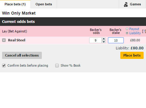 E.g. I will stake £10 on odds of 9 that if my horse does not win I will win £10. Because the odds are 9, I am betting that one of the other horse 'will win'. Therefor Ian betting against the other horses at £10 per horse, there are 9 horses so my liability is £80. If I loose and my horse wins I loose £80. If I win and my horse looses I win £10. You need to have the 'liability' amount in your balance before making the bet. A Back bet is a standard bet to back a team, horse, individual etc. I bet that horse 'will' win. A back lay bet is a sure bet. A software scans bookmakers and finds options where placing Back and Lay bet on 2 different bookmakers can make a profit. The Back bet has to have higher odds than the Lay bet to be able to generate a profit. E.g. The Software has found that there is a Back Lay bet available with a profit of 19.40%. William hill is offering 'Backing' odds of '3' for Team A to win. Betfair is offering 'Laying' odds of '2' for Team A not to win. When you Lay a bet the Bookmaker always takes a commission, which is usually around 3-5%. We add the odds, our 'Backing' stake and Betfair's commission to the calculator and hit calculate.